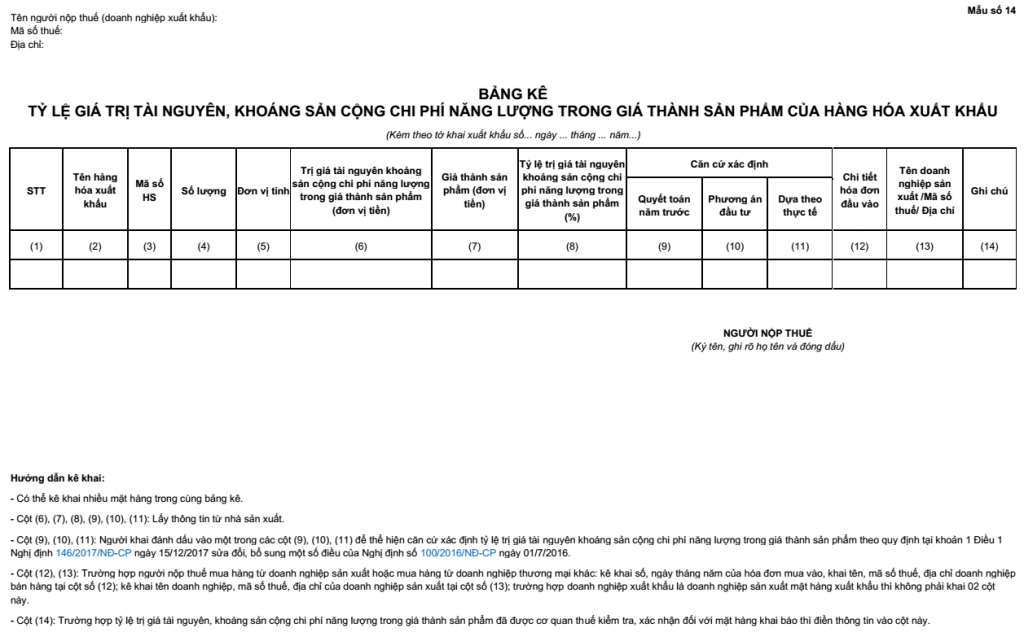 Đối với các mặt hàng được chi tiết mã hàng 08 chữ số và mô tả hàng hóa của các nhóm 25.23, 27.06, 27.07, 27.08, 68.01, 68.02, 68.03 tại STT 211 của Biểu thuế xuất khẩu, người khai hải quan kê khai mức thuế suất thuế xuất khẩu tương ứng với mã hàng đó quy định tại STT 211. Trường hợp không kê khai mức thuế suất thuế xuất khẩu theo quy định tại nhóm STT 211 thì người nộp thuế phải nộp BẢNG KÊ TỶ LỆ GIÁ TRỊ TÀI NGUYÊN, KHOÁNG SẢN CỘNG CHI PHÍ NĂNG LƯỢNG TRONG GIÁ THÀNH SẢN PHẨM CỦA HÀNG HÓA XUẤT KHẨU theo Mẫu số 14 ban hành kèm theo Nghị định 101/2021/NĐ-CP tại thời điểm làm thủ tục hải quan để chứng minh hàng hoá kê khai có tổng trị giá tài nguyên, khoáng sản cộng chi phí năng lượng dưới 51% giá thành sản phẩm. Trường hợp người nộp thuế là doanh nghiệp thương mại mua hàng từ doanh nghiệp sản xuất hoặc doanh nghiệp thương mại khác để xuất khẩu nhưng không kê khai mức thuế suất thuế xuất khẩu theo quy định tại nhóm STT 211 thì người nộp thuế căn cứ thông tin của doanh nghiệp sản xuất cung cấp để thực hiện kê khai theo Mẫu số 14 nêu trên để chứng minh tỷ lệ tài nguyên, khoáng sản cộng chi phí năng lượng dưới 51% giá thành sản phẩm. Người nộp thuế phải chịu trách nhiệm trước pháp luật về tính chính xác của việc khai báo.