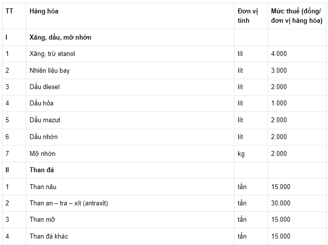 Cụ thể mức thuế bảo vệ môi trường được quy định trong nghị quyết như sau: