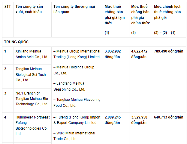 3.Mức thuế và danh sách các công ty bị áp dụng thuế chống bán phá giá chính thức
