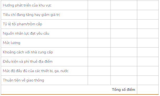 Với các tiêu chí như trên, thường các địa điểm sẽ được chấm dựa trên một bảng tiêu chí. để từ đó đưa ra quyết định phù hợp: