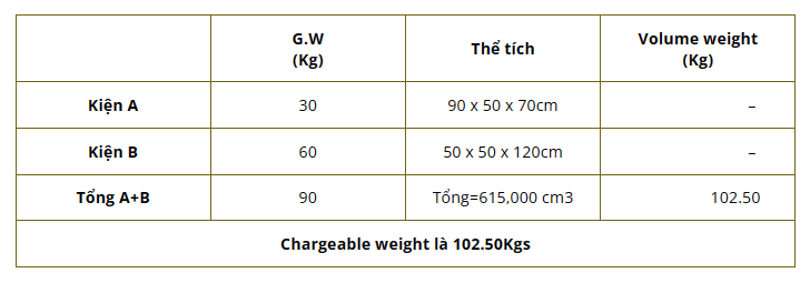 – So sánh gross weight và volume weight, số nào lớn hơn thì dùng để tính chi phí vận chuyển