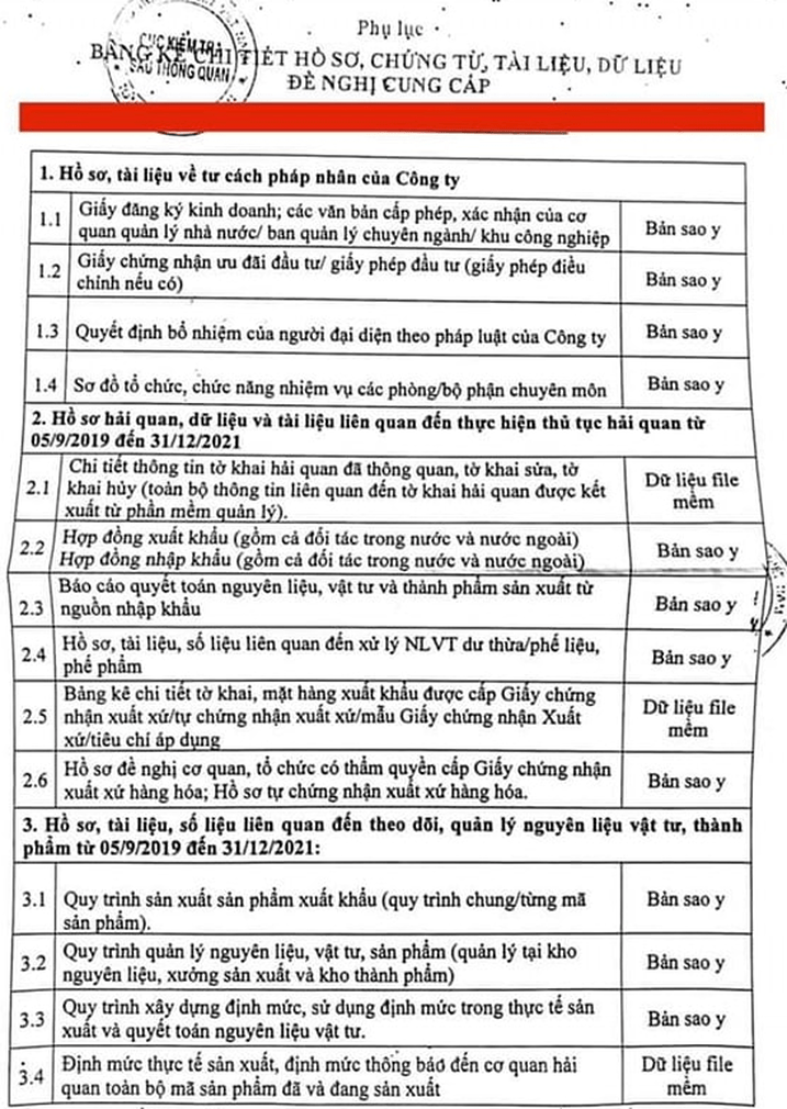 – Báo cáo tài chính các năm trong giai đoạn kiểm tra: Biên bản kiểm kê hàng tồn kho cuối năm tài chính, các loại sổ kế toán, sổ quỹ, chứng từ kế toán các loại liên quan đến việc thực hiện các điều khoản của hợp đồng mua bán với thương nhân nước ngoài, với khách hàng trong nước,… các loại sổ, phiếu theo dõi nhập kho- xuất kho nguyên phụ liệu, nhập kho- xuất kho thành phẩm, báo cáo xuất nhập tồn nguyên liệu, thành phẩm trong giai đoạn kiểm tra. Sổ theo dõi, chứng từ thực hiện việc mua bán, thanh toán nguyên phụ liệu cung ứng trong nước, vận chuyển nội địa,…