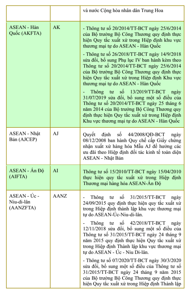+ Thông tư 07/2020/TT-BCT 30/3/2020 Sửa đổi, bổ sung một số điều của Thông tư số 31/2015/TT-BCT ngày 24 tháng 9 năm 2015 của Bộ trưởng Bộ Công Thương quy định thực hiện Quy tắc xuất xứ trong Hiệp định Thành lập khu vực thương mại tự do ASEAN – Úc – Niu Di-lân.