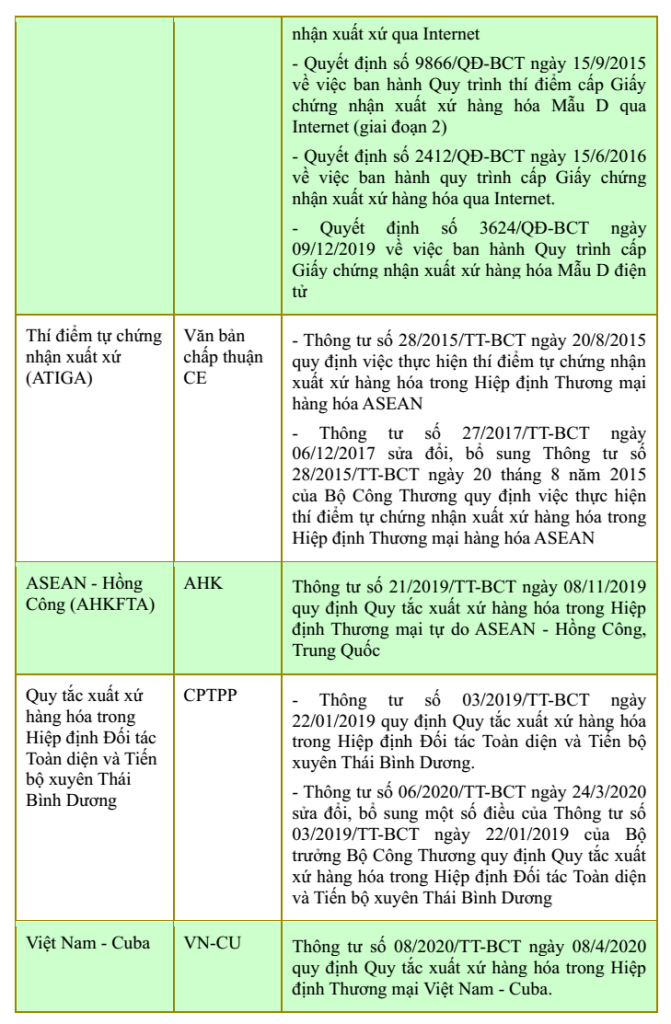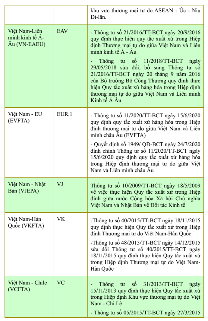 CÁC VĂN BẢN PHÁP LUẬT HƯỚNG DẪN VỀ QUY TẮC XUẤT XỨ HÀNG HOÁ THEO CÁC HIỆP ĐỊNH THƯƠNG MẠI TỰ DO MÀ VIỆT NAM ĐÃ KÝ KẾT.