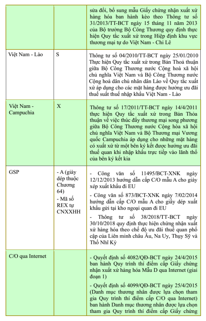 + Thông tư 05/2015/TT-BCT ngày 27/3/2015 Sửa đổi, bổ sung mẫu Giấy CNXXHH ban hành kèo theo Thông tư số 31/2013/TT-BCT ngày 15 tháng 11 năm 2013 của Bộ trưởng Bộ Công Thương quy định thực hiện Quy tắc xuất xứ trong Hiệp định khu vực thương mại tự do Việt Nam – Chi Lê.