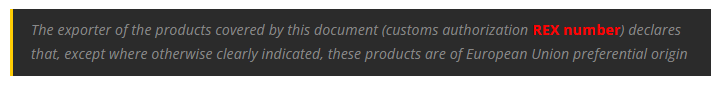 Nếu như các FTA khác yêu cầu phải có Giấy chứng nhận xuất xứ (C/O-Certificate of origin), EVFTA cho phép nhà xuất khẩu phía châu Âu được tự chứng nhận xuất xứ theo cơ chế REX. Tại đây, chứng từ xuất xứ có thể là invoice, packing list hay delivery note, trong đó nhà xuất khẩu tự chứng minh xuất xứ bằng dòng tuyên bố theo cấu trúc (bắt buộc) như sau: