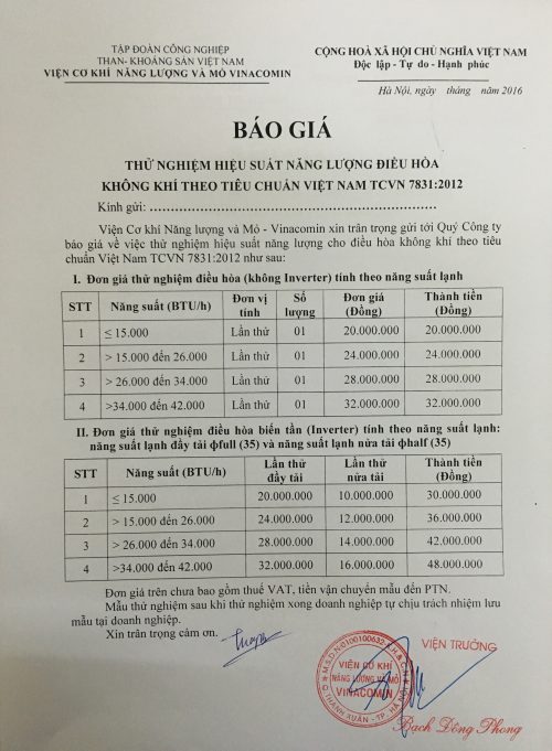 - Chi phí thử nghiệm: căn cứ theo năng suất lạnh (BTU/h) và có Inverter hay không Inverter, tham khảo bảng giá của Vinacomin dưới đây: