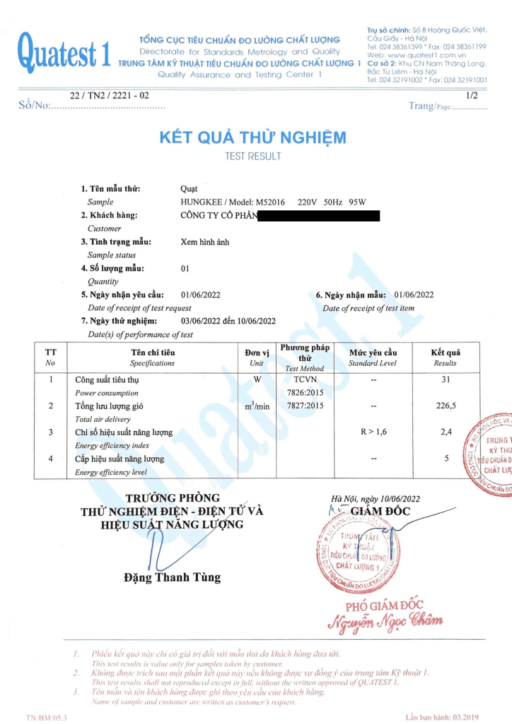 Mặt hàng quạt điện thử nghiệm theo TCVN 7826:2015 Quạt điện – Hiệu suất năng lượng – Hiệu suất năng lượng tại Quatest 1, Quatest 2, Quatest 3 hoặc Vinacomin.
