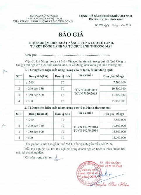 Mặt hàng Tủ lạnh, Tủ đông thử nghiệm theo TCVN 7828:2016 Tủ lạnh, tủ kết đông – Hiệu suất năng lượng tại Quatest 1, Quatest 3 hoặc Vinacomin.