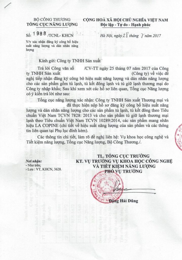 - Giấy đăng ký công bố dán nhãn năng lượng