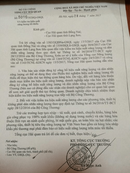 - Nếu kết quả HSNL quá 6 tháng thì nộp công văn xác nhận đã công bố dán nhãn năng lượng của Bộ công thương cho Hải quan để được thông quan tờ khai