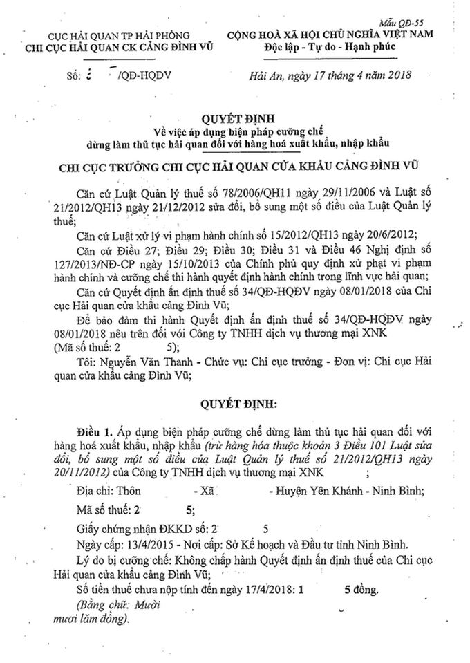 Quyết định về việc áp dụng biện pháp Cưỡng chế dừng làm thủ tục hải quan đối với hàng hóa xuất nhập khẩu.