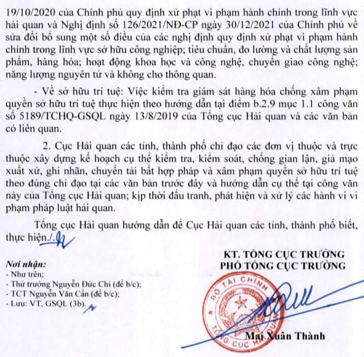 Nguồn: Công văn 4823/TCHQ-GSQL ngày 01/11/2022 V/v tăng cường kiểm tra, chống gian lận, giả mạo xuất xử, ghi nhãn hàng hóa, chuyển tải bất hợp pháp, xâm phạm quyền SHTT.
