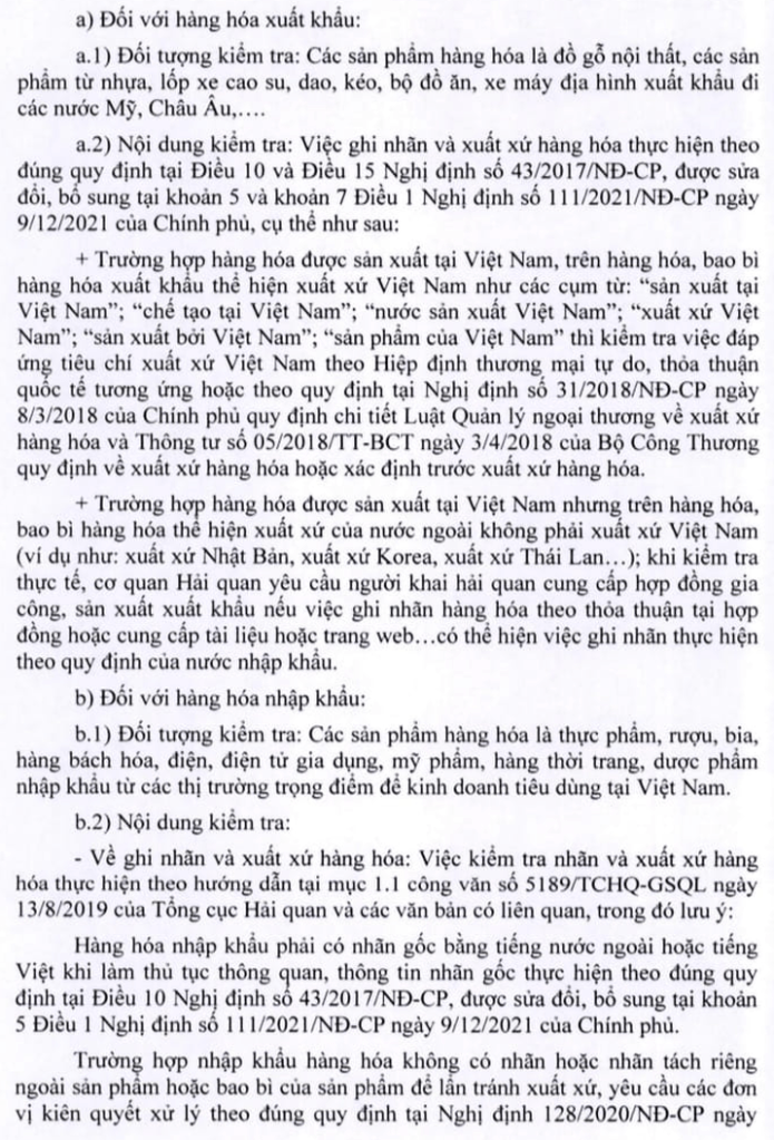 + Trường hợp hàng hóa được sản xuất tại Việt Nam, trên hàng hóa, bao bì hàng hóa xuất khẩu thể hiện xuất xứ Việt Nam như các cụm từ: “sản xuất tại Việt Nam”; “chế tạo tại Việt Nam”; “nước sản xuất Việt Nam”; “xuất xứ Việt Nam”; “sản xuất bởi Việt Nam”; “sản phẩm của Việt Nam” thì kiểm tra việc đáp ứng tiêu chí xuất xứ Việt Nam theo Hiệp định thương mại tự do, thỏa thuận quốc tế tương ứng hoặc theo quy định tại Nghị định số 31/2018/NĐ-CP ngày 8/3/2018 của Chính phủ quy định chi tiết Luật Quản lý ngoại thương về xuất xứ hàng hóa và Thông tư số 05/2018/TT-BCT ngày 3/4/2018 của Bộ Công Thương quy định về xuất xứ hàng hóa hoặc xác định trước xuất xứ hàng hóa.
