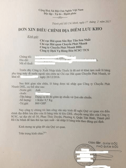 Bước 1: Làm công văn “xin điều chỉnh địa điểm lưu kho”, tức là xin chuyển hàng từ kho của công ty chuyển phát nhanh về lại của khẩu mà hàng nhập về lần đầu tiên. TSC hoặc SCSC (nếu ở TP.HCM)