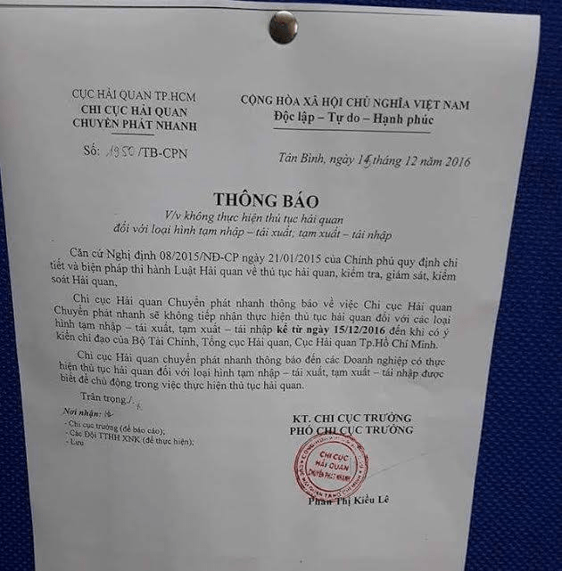 Kể từ ngày 15/12/2016 Chi cục Hải quan Chuyển Phát Nhanh (Hải quan TP. Hồ Chí Minh) đã ra thông báo 1950/TB-CPN cho các doanh nghiệp là sẽ không tiếp nhận thực hiện thủ tục hải quan đối với các loại hình tạm nhập tái xuất – tạm xuất tái nhập.