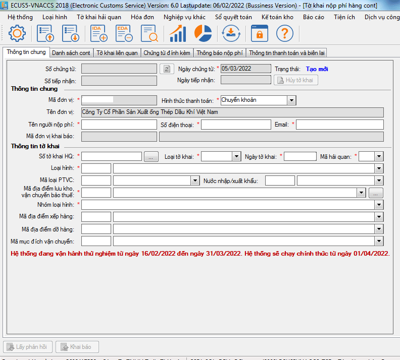 Cập nhật 05/3/2022: Khai báo nộp phí CSHT cảng biển Tp.Hcm cho hàng container / hàng rời, lỏng…. trên phần mềm khai báo hải quan điện tử.