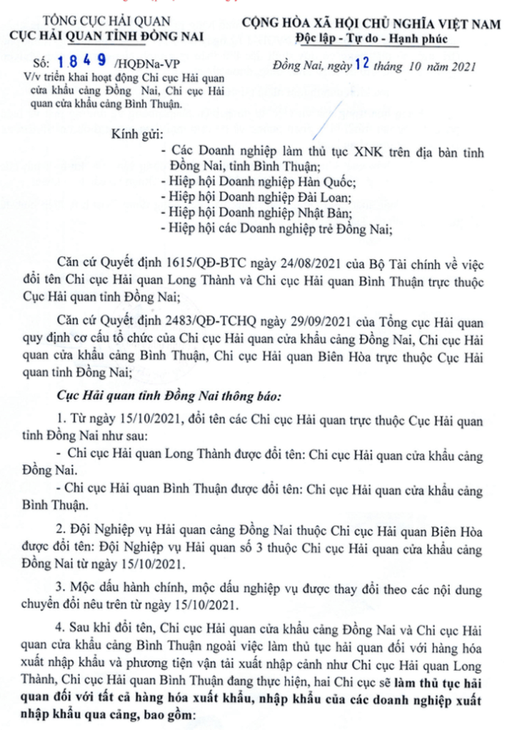 Bộ Tài chính vừa ban hành quyết định về việc đổi tên 2 chi cục trực thuộc Cục Hải quan Đồng Nai kể từ ngày 15/10/2021. Trong đó, Chi cục Hải quan Long Thành được đổi thành Chi cục Hải quan cửa khẩu cảng Đồng Nai và Chi cục Hải quan Bình Thuận đổi thành Chi cục Hải quan cửa khẩu cảng Bình Thuận.