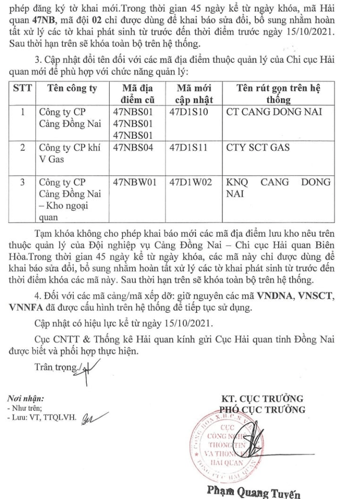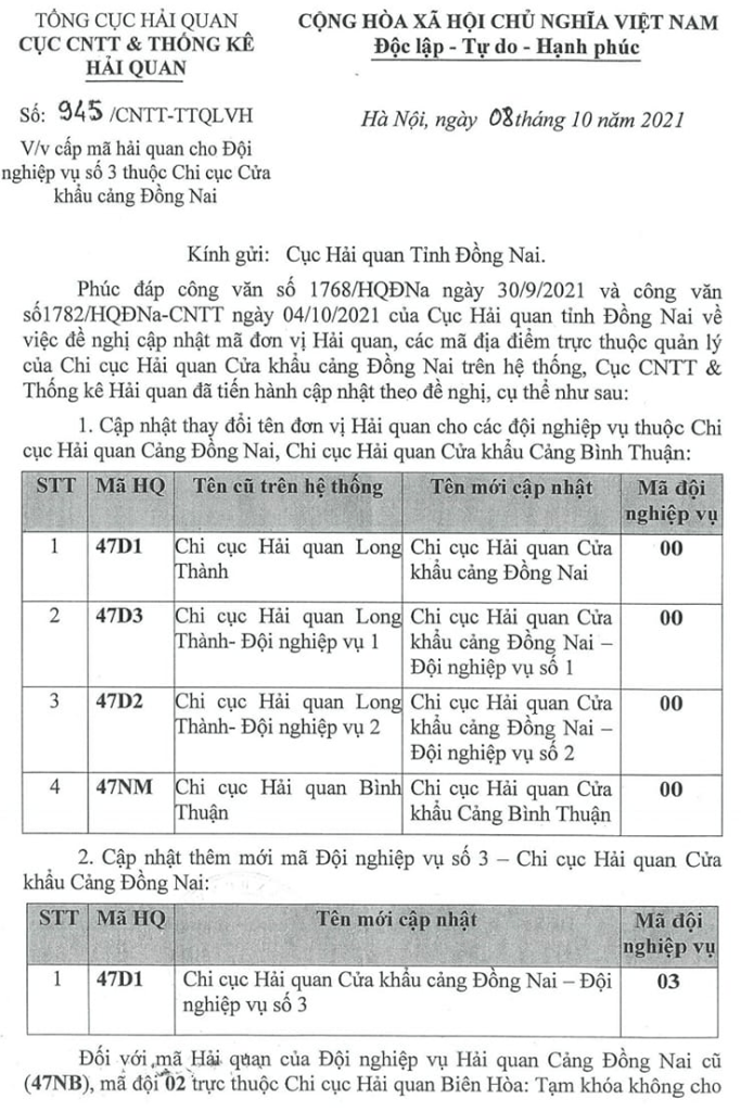 – Mã CCHQ quản lý: 47D1 – Chi cục Hải quan cửa khẩu cảng Đồng Nai (trước 15/10/2021 là CCHQ Long Thành)
