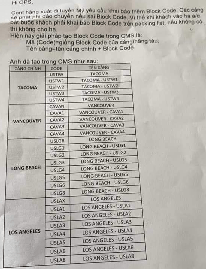 Theo thông tin của hãng tàu OOCL. “Yêu cầu quý khách hàng ghi rõ Block Code khi hạ container hàng xuất về ICDs / Cát Lái Giang Nam / TCTT với cảng Long Beach cho tuyến dịch vụ của hãng tàu OOCL tại TCTT”.