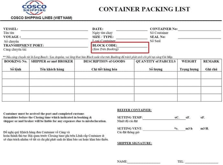 Nếu khách hàng không ghi chú BLOCKCODE này sẽ không được hạ container. Nếu ghi sai Blockcode number, khách hàng sẽ chịu trách nhiệm chi phí phát sinh.