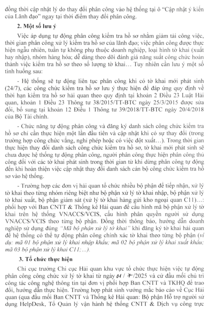 Theo Cục Hải quan, kể từ ngày 1/7/2025, hệ thống VNACCS/VCIS sẽ chính thức thực hiện chức năng tự động phân công chức kiểm tra hồ sơ hải quan. Công văn số 9689/CHQ-CNTT hướng dẫn các chi cục hải quan khu vực chính thức triển khai chức năng tự động phân công công chức kiểm tra hồ sơ trên hệ thống VNACCS/VCIS từ ngày 1/7/2025.