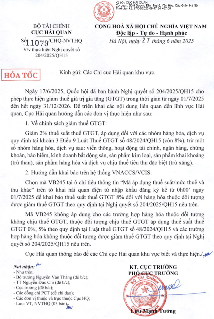 Chọn mã VB245 tại ô chỉ tiêu thông tin “Mã áp dụng thuế suất/mức thuế và thu khác” trên tờ khai hải quan điện từ nhập khẩu đăng ký kể từ 0h00′ ngày 01/7/2025 để khai báo thuế suất thuế GTGT 8% đối với hàng hóa thuộc đối tượng được giảm thuế GTGT theo quy định tại Nghị quyết số 204/2025/QH15 nêu trên.