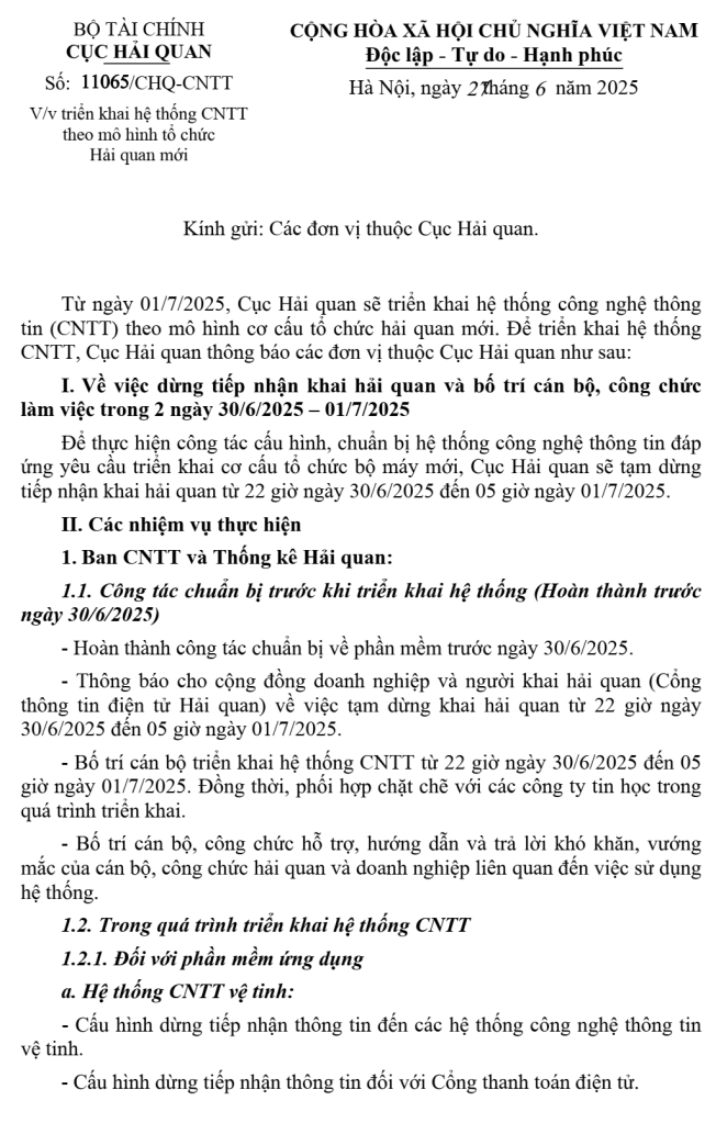 Do đó, để chuẩn bị triển khai hệ thống, Cục Hải quan sẽ tạm dừng tiếp nhận khai hải quan từ 22 giờ ngày 30/6 đến 5 giờ ngày 1/7/2025.
