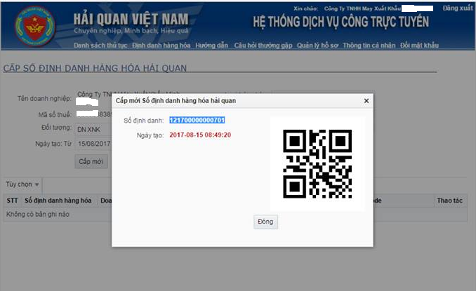 * Số định danh sẽ được in ra giấy dưới dạng mã vạch QR code để cung cấp cho doanh nghiệp cảng khi đưa hàng hóa ra / vào.