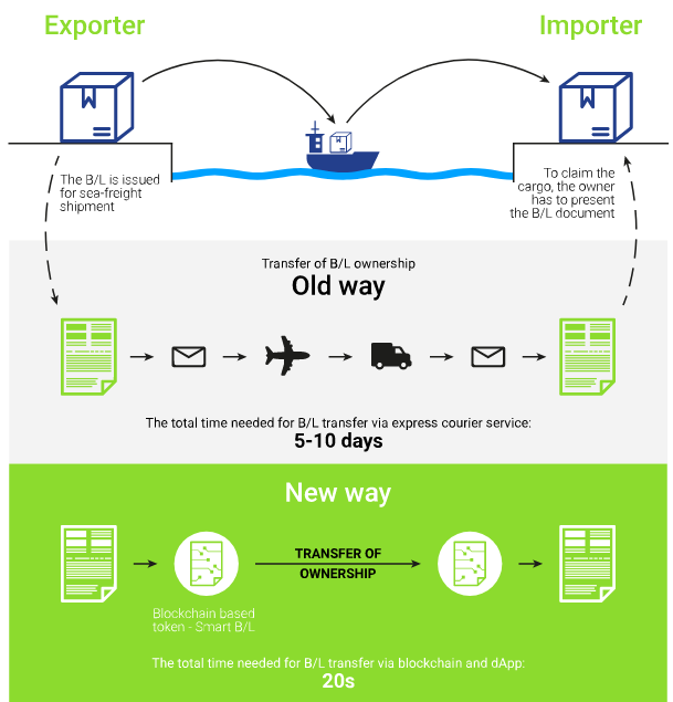 Bằng cách sử dụng Smart B/L, là một mã thông báo dựa trên blockchain, chúng tôi cắt giảm thời gian và chi phí cần thiết cho việc chuyển khoản B/L. Bằng cách gửi các thẻ trên blockchain, bạn có thể thay đổi quyền sở hữu từ Exporter to Importer một cách dễ dàng và an toàn, làm cho công cụ Smart B/L trở thành công cụ hoàn hảo để vận chuyển và yêu cầu quyền sở hữu hàng hoá.