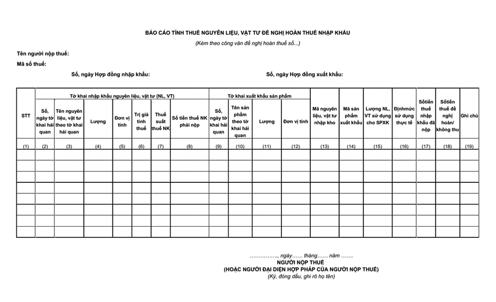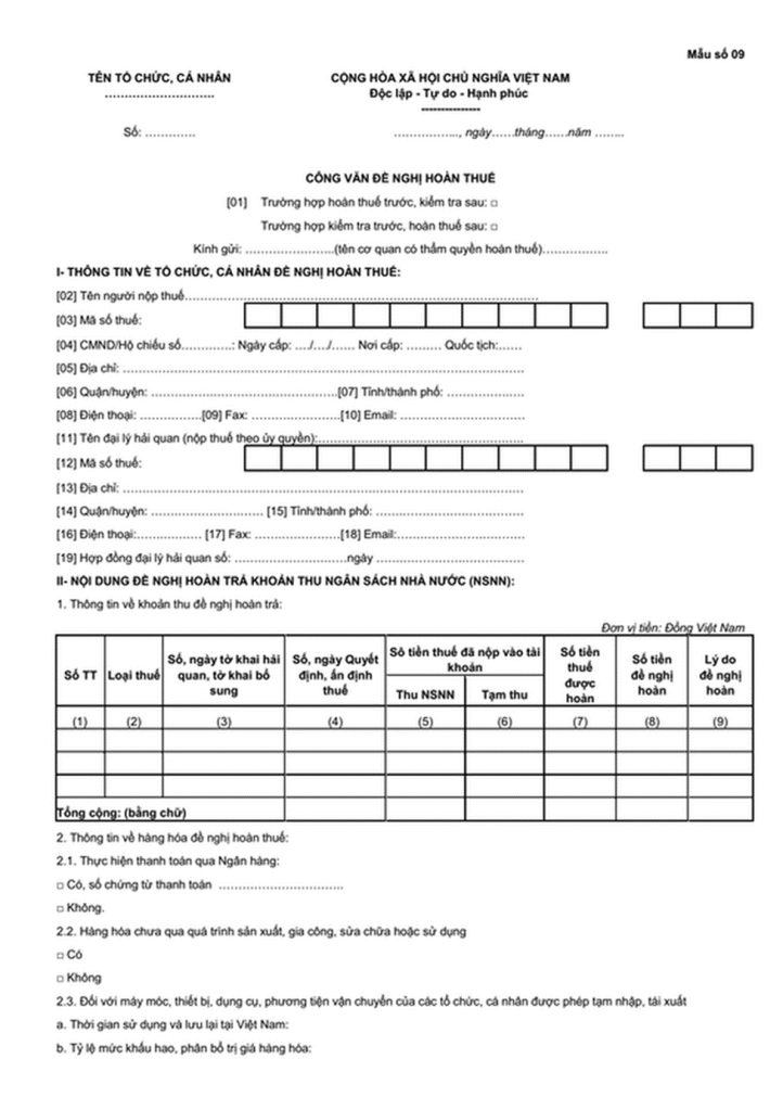 Mẫu số 09 – Công văn đề nghị hoàn thuế XNK