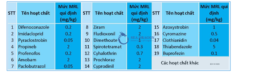 Dư lượng thuốc bảo vệ thực vật MRL sẽ do Codex (CXL) hoặc cơ quan quản lý tại quốc gia nhập khẩu quy định và được biểu thị bằng đơn vị mg/kg trọng lượng sản phẩm.