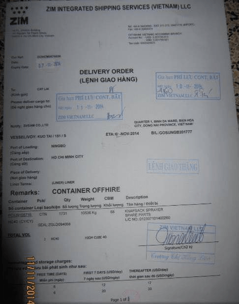 ***Lưu ý: đối với hợp đồng thanh toán bằng L/C (thư tín dụng), khi đến nhận bộ lệnh giao hàng, phải mang B/L gốc có ký hậu của ngân hàng.