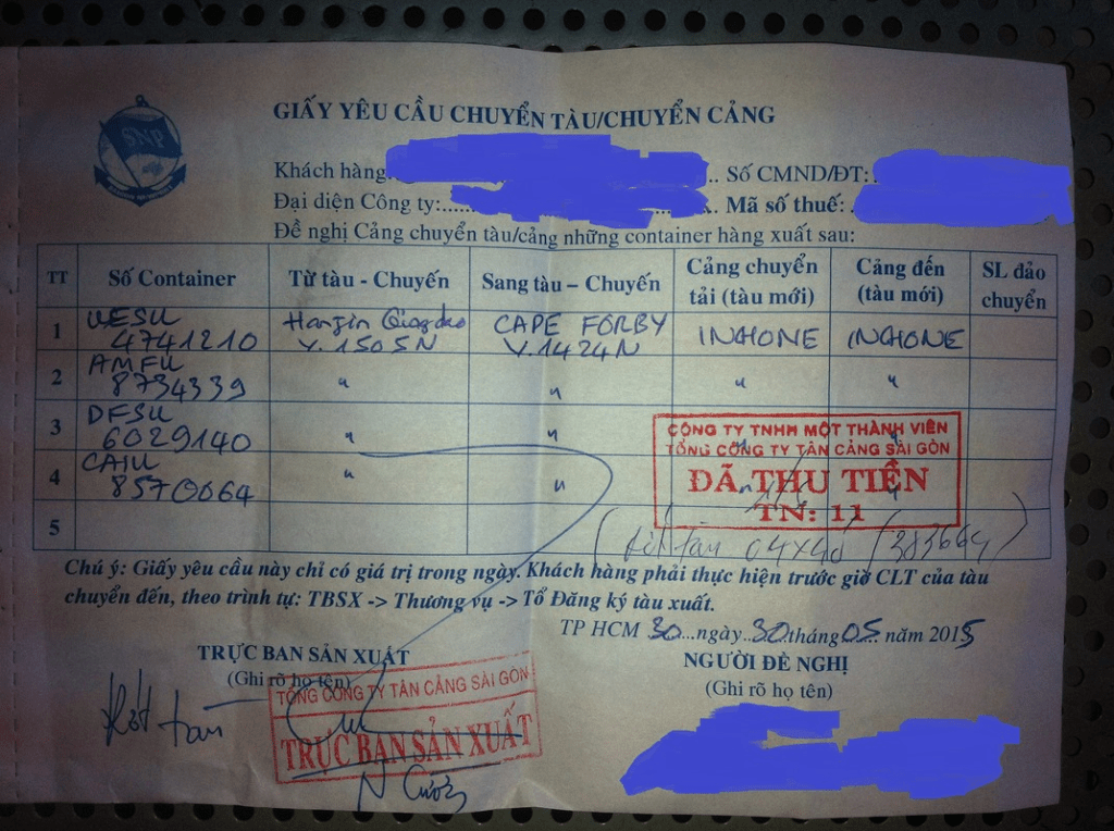 B3 – Lên hãng tàu của cont cũ đóng tiền lưu kho bãi và thủ tục, sau đó ký xác nhận đồng ý sang cont, hãng tàu sẽ cấp giấy hạ cont cũ tại bãi chỉ định.