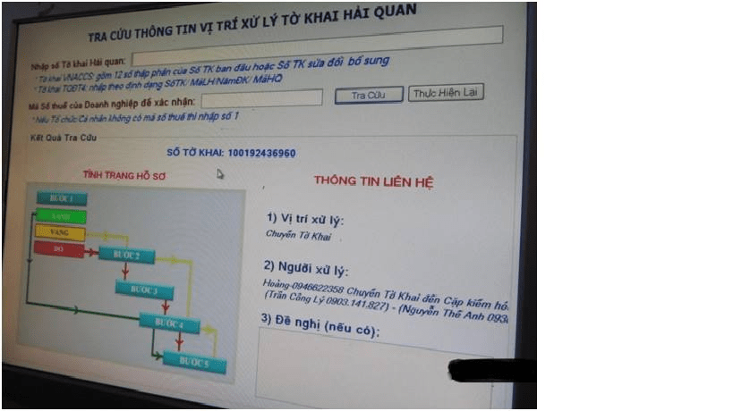 Nhập số tờ khai, mã số thuế vào máy tính ở cảng để biết cửa nôp bộ chứng từ.(ở Cát Lái có trang bị những máy tính để làm, màng hình như hình dưới)