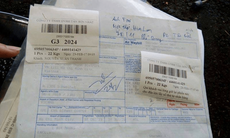 + Air waybill (nên nhớ là lấy cái bill mà lúc mình đóng tiền thương vụ đó có chữ kí của con thương vụ).