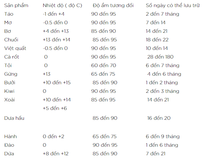 Dưới đây là bảng tham khảo nhiệt độ và độ ẩm để bảo quản 1 số loại hoa quả