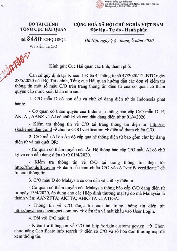 Nội dung Công văn 3480/TCHQ-GSQL ngày 29/05/2020 V/v Kiểm tra C/O.