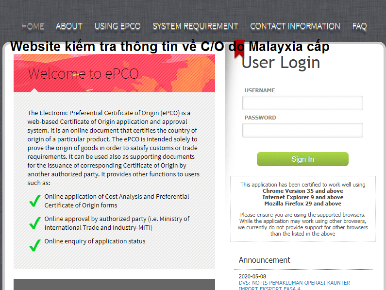 Thông tin về C/O được tra cứu tại trang thông tin điện tử: http://newepco.dagangnet.com.my -> điền tên và mật khẩu vào User Login.
