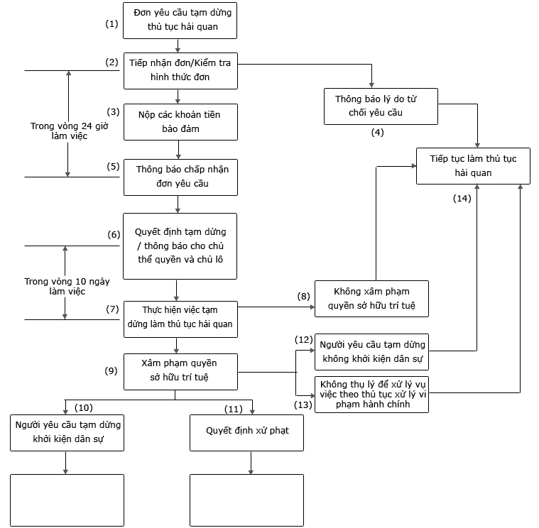 Trong thời gian chờ phản hồi từ chủ thể quyền, chi cục hải quan lấy mẫu hoặc chụp ảnh về hàng hóa, áp dụng biện pháp bảo đảm xử lý vi phạm hành chính nếu có căn cứ chính xác khẳng định hàng hóa giả mạo về SHTT. Trường hợp chủ thể quyền yêu cầu tạm dừng làm thủ tục hải quan và và nộp khoản tiền bảo đảm (20% trị giá lô hàng bị nghi ngờ hoặc 20 triệu đồng nếu không xác định được trị giá lô hàng trong thời hạn hoặc chứng từ bảo lãnh), chi cục hải quan ra quyết định tạm dừng trong thời hạn 10 ngày làm việc kể từ ngày ra quyết định, thời hạn tạm dừng có thể kéo dài nhưng không quá 20 ngày làm việc. Hết thời hạn tạm dừng làm thủ tục hải quan, nếu kết quả xác minh (về nguồn gốc, xuất xứ hàng hóa, giám định về SHTT, xác nhận hàng hóa giả mạo về SHTT của chủ thể quyền) xác định hàng hóa giả mạo SHTT thì hải quan tạm giữ hàng hóa vi phạm và xử phạt vi phạm theo thủ tục hành chính. Nếu kết quả xác minh vụ việc xác định hàng hóa không phải là hàng hóa giả mạo SHTT, hải quan tiếp tục làm thủ tục thông quan cho lô hàng.