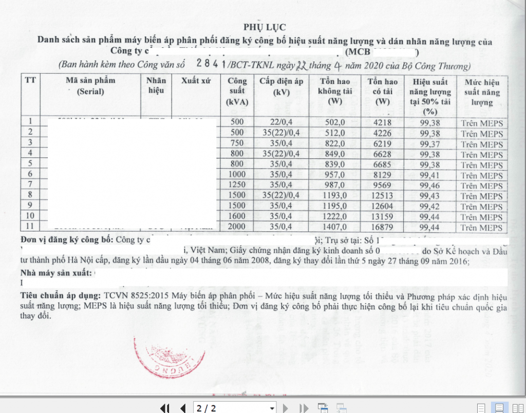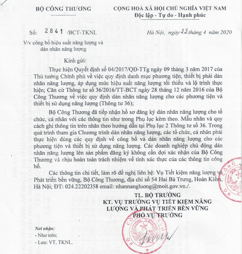 Để thuận tiện cho quá trình làm việc với các cơ quan kiểm tra chuyên ngành, nên làm công văn xin xác nhận của Bộ Công thương xác nhận Doanh nghiệp đã thực hiện công bố dán nhãn năng lượng máy biến áp. Có thể tham khảo mẫu công văn xác nhận của Bộ công thương dưới đây: