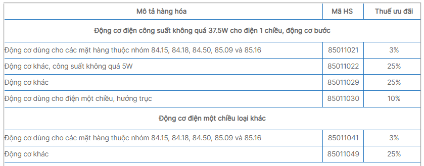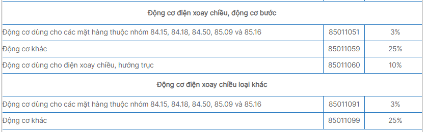 Thuế nhập khẩu động cơ điện xác định theo mã HS: