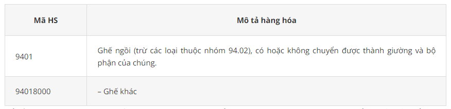 * Mặt hàng là ghế nhựa dành cho trẻ em có mã HS thuộc Chương 94 – Đồ nội thất; Bộ đồ giường, khung đệm, nệm và các đồ dùng nhồi tương tự; Đèn và bộ đèn, chưa được chi tiết hoặc ghi ở nơi khác; Biển hiệu được chiếu sáng, biển đề tên được chiếu sáng và các loại tương tự; Nhà lắp ghép.