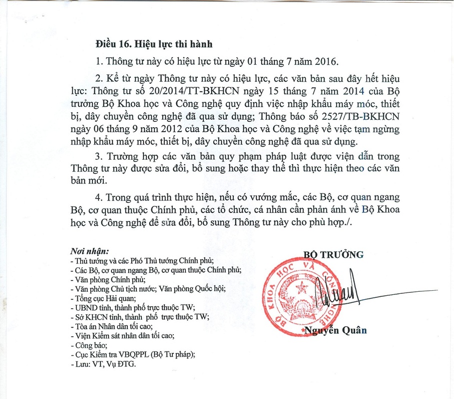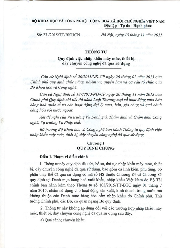Thông tư 23/2015/TT-BKHCN ngày 13/11/2015 về nhập khẩu máy móc, thiết bị, dây chuyền công nghệ đã qua sử dụng sẽ chính thức có hiệu lực từ ngày 01/07/2016 vàthay thếTT 20/2014/TT-BKHCN quy định việc nhập khẩu máy móc, thiết bị, dây chuyền công nghệ đã qua sử dụng, Thông báo số 2527/TB-BKHCN về việc tạm ngừng nhập khẩu máy móc, thiết bị, dây chuyền công nghệ đã qua sử dụng.