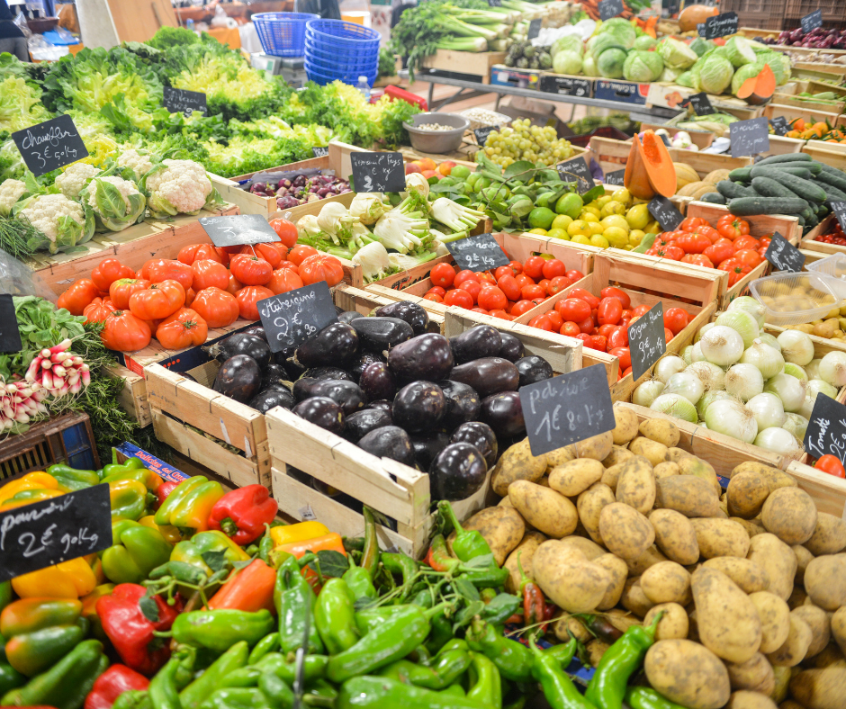 Hàng rau củ quả tươi: vải thiều, xoài, sầu riêng, dừa, chuối, thanh long, sả, riềng, củ đậu (củ sắn), các loại rau, lá dong, lá chuối, hành tím.