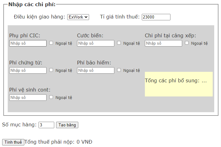 Tính thuế nhập khẩu và VAT cho hàng nhập khẩu trực tuyến tại đây. Bạn nhập số liệu, phần mềm sẽ tính số thuế bạn phải nộp.