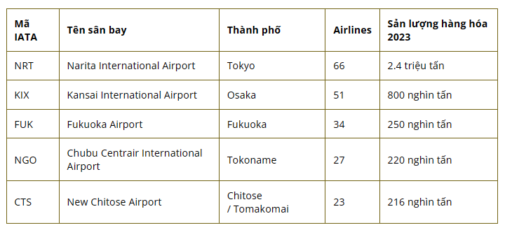 Nhật Bản là một trong những cường quốc kinh tế đứng đầu châu Á và thế giới nói chung. Đất nước xứ hoa anh đào nổi tiếng về những sản phẩm công nghệ, giá trị cao. Chính vì thế, vận tải hàng không rất phát triển tại đất nước này với rất nhiều sân bay dải khắp đất nước. Dưới đây là xếp hàng 5 sân bay lớn nhất Nhật Bản tính theo sản lượng hàng hóa khai thác hàng năm: