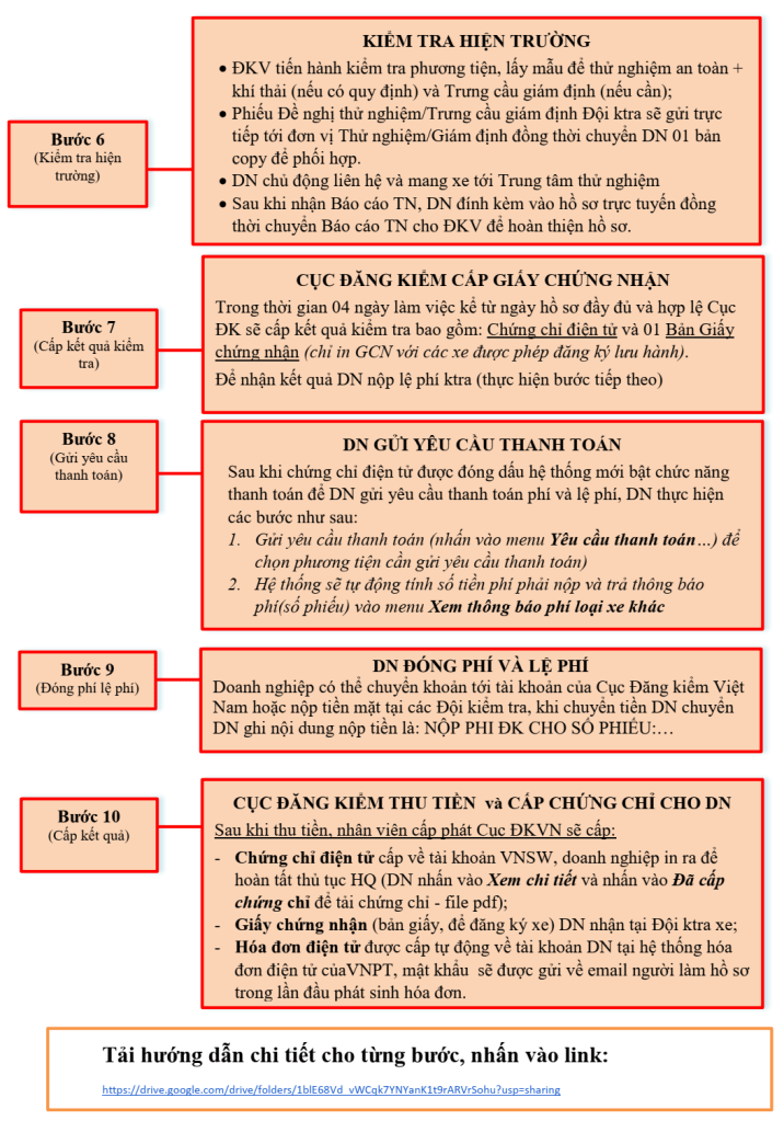Cục đăng kiểm sẽ kiểm tra thực tế và duyệt kết quả kiểm tra sau đó sẽ phản hồi lại cho doanh nghiệp.
