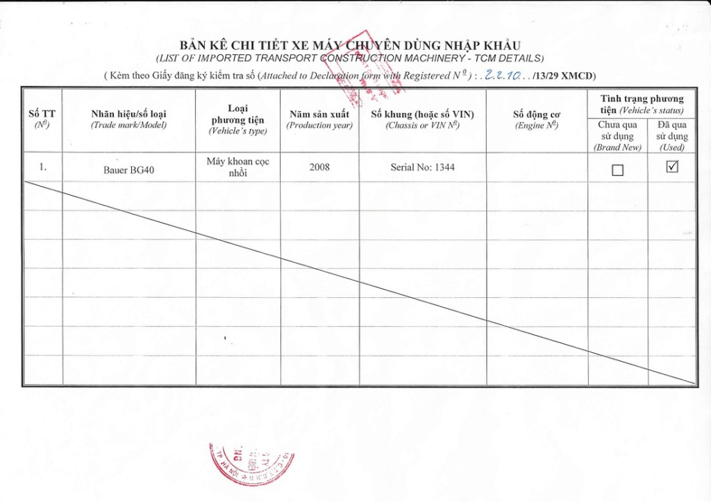 + Đối với XMCD đã qua sử dụng: Tài liệu kỹ thuật của XMCD đăng ký kiểm tra HOẶC Bản đăng ký thông số kỹ thuật XMCD nhập khẩu.