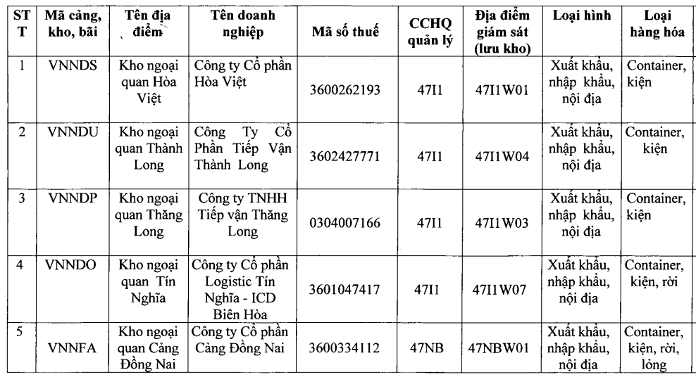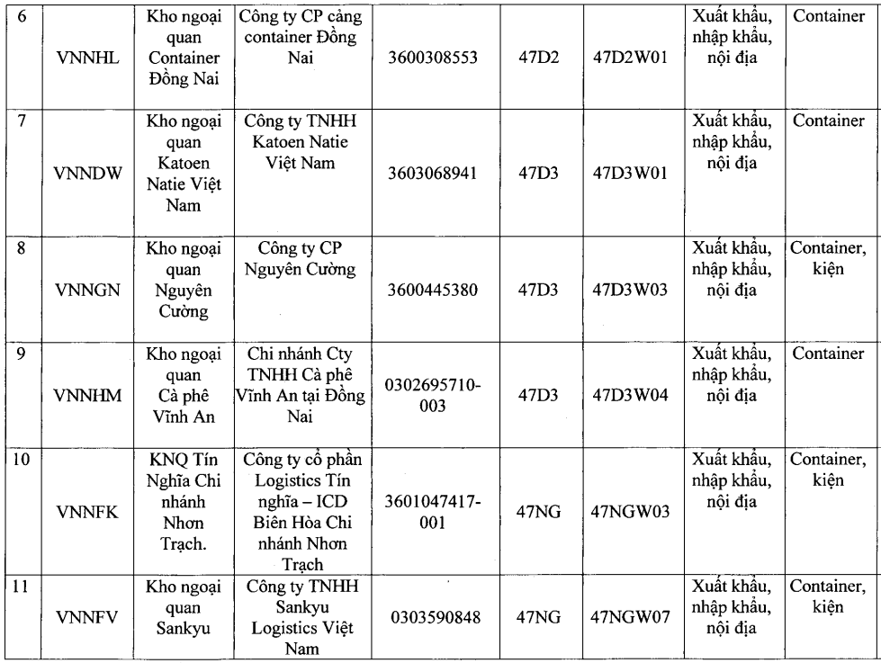 Mã VNACCS địa điểm lưu kho chờ thông quan dự kiến – mã VNACCS Địa điểm Xếp hàng / Địa đểm Dỡ hàng KNQ – Mã Địa điểm đích cho vận chuyển bảo thuế của một số Kho Ngoại Quan trên địa bàn tỉnh Đồng nai do CCHQ Nhơn Trạch, Long thành, Biên hòa, Long bình tân quản lý.